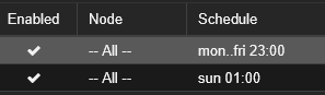 The backup jobs run automatically for all nodes Monday through Friday at 11 p. m. and Sundays at 1 a. m.