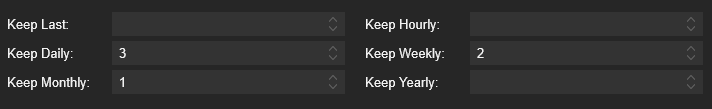 Backup retention defines how many backups of different intervals are kept before older ones are automatically removed. Older backups will be pruned automatically. The following settings apply: