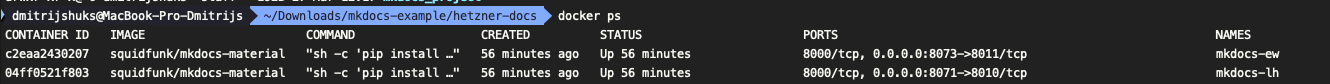 In the screenshot, the first docker container shows the contents of the EW documents: mkdocs-ew. The second docker container shows the contents of the LH documents: mkdocs-lh.